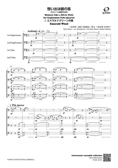 商品説明 その後、ユーフォチューバカルテットでアレンジし直してほしいと再打診を受け、厚木王子高校吹奏楽部のご協力のもと完成し、2025年11月に昭和音楽大学の「昭和ユーフォニアム・チューバアンサンブル」によって初演されました。音域の高い所は下げても大丈夫ですが、メロディーラインは埋もれないように注意してください。3楽章はスウィングしてもそのまま演奏しても大丈夫です。あえてアーティキュレーションはそれほど記載してないので、自由に演奏してもらえたら嬉しいです。(伊藤優晶)編成:Eup. 1/Eup. 2/Tuba 1/Tuba2 商品番号 F0245072 ジャンル 管楽器、アンサンブル楽譜、ユーフォニウム(バリトンB.C含)、チューバ(バス含) 編著者 伊藤優晶 初版日 2025年11月06日 JANコード 4595059851537