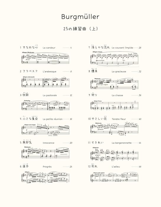 原典版を元に、初心者でも使いやすく工夫された楽譜と、楽しみながら練習できる課題ページがセットになりました。ブルグミュラーコンクール指定の繰り返し表記を採用した、見やすい大判楽譜です。ブルグミュラー25の練習曲から、1~12番を掲載しています。
